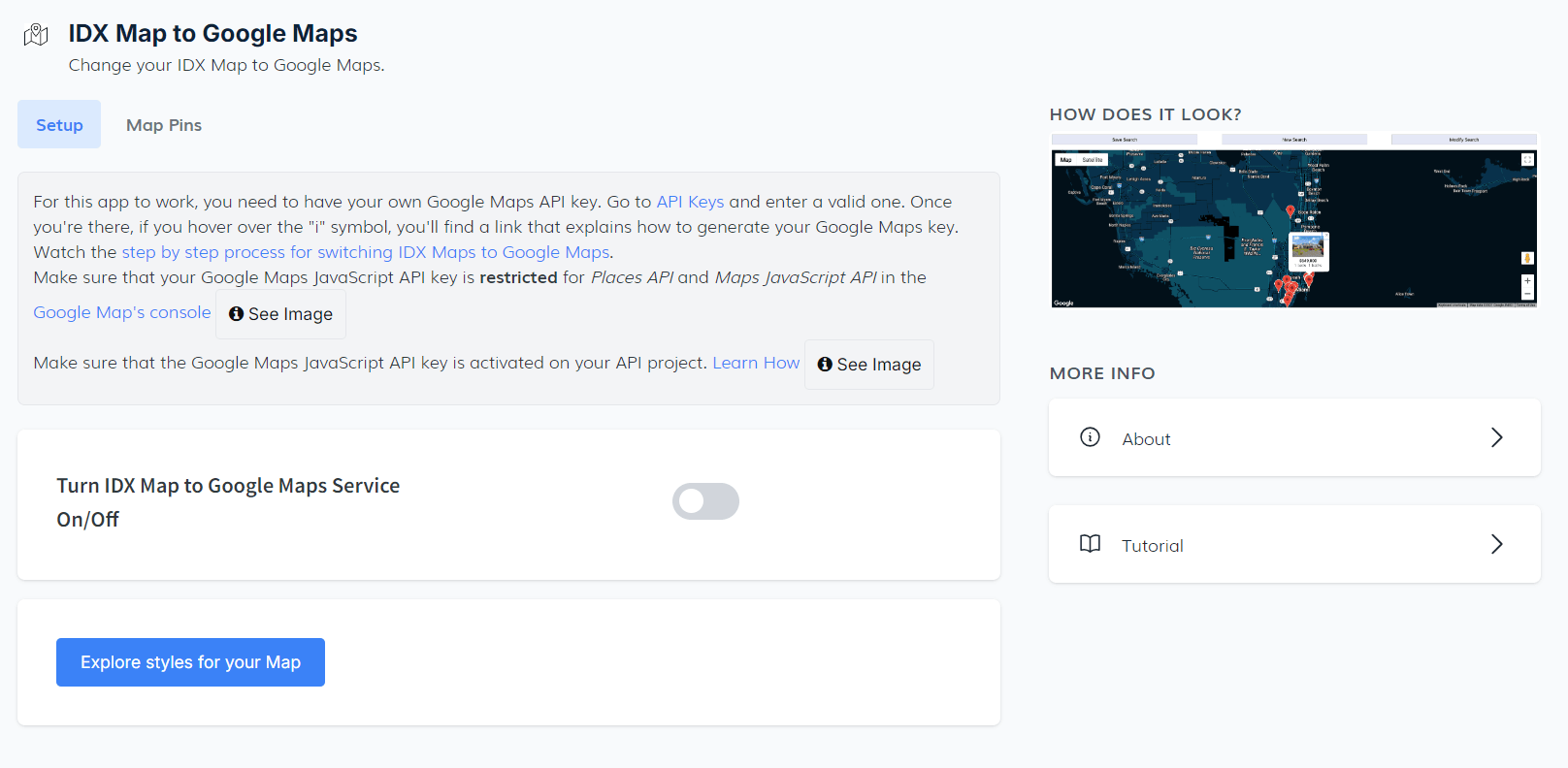 To get started, obtain your own Google Maps API key and configure it in the app settings. Once you have a valid key, you will be ready to replace your existing IDX Maps with the enhanced capabilities of Google Maps.