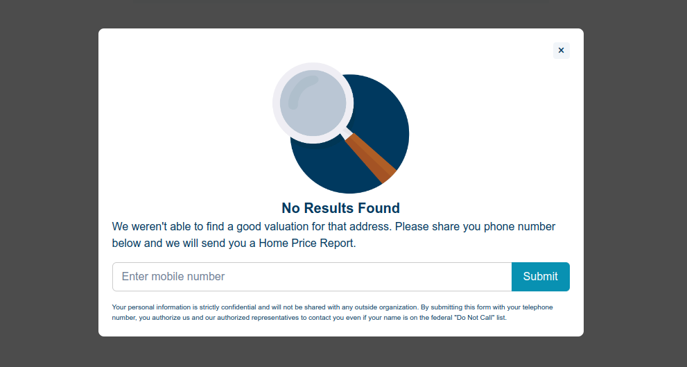 If a user's address is not listed in the widget's database, the tool offers an option to input their phone number. The Home Valuation Widget also enables your users to connect with you to get further assistance. This ensures that potential leads never go unanswered.