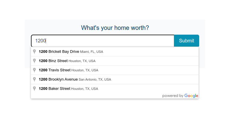This Home Valuation Widget offers an intuitive auto-complete feature that allows users to quickly input their property's address. By simply typing in the first few letters of their address, the tool will suggest a full address with Google's verified accuracy.