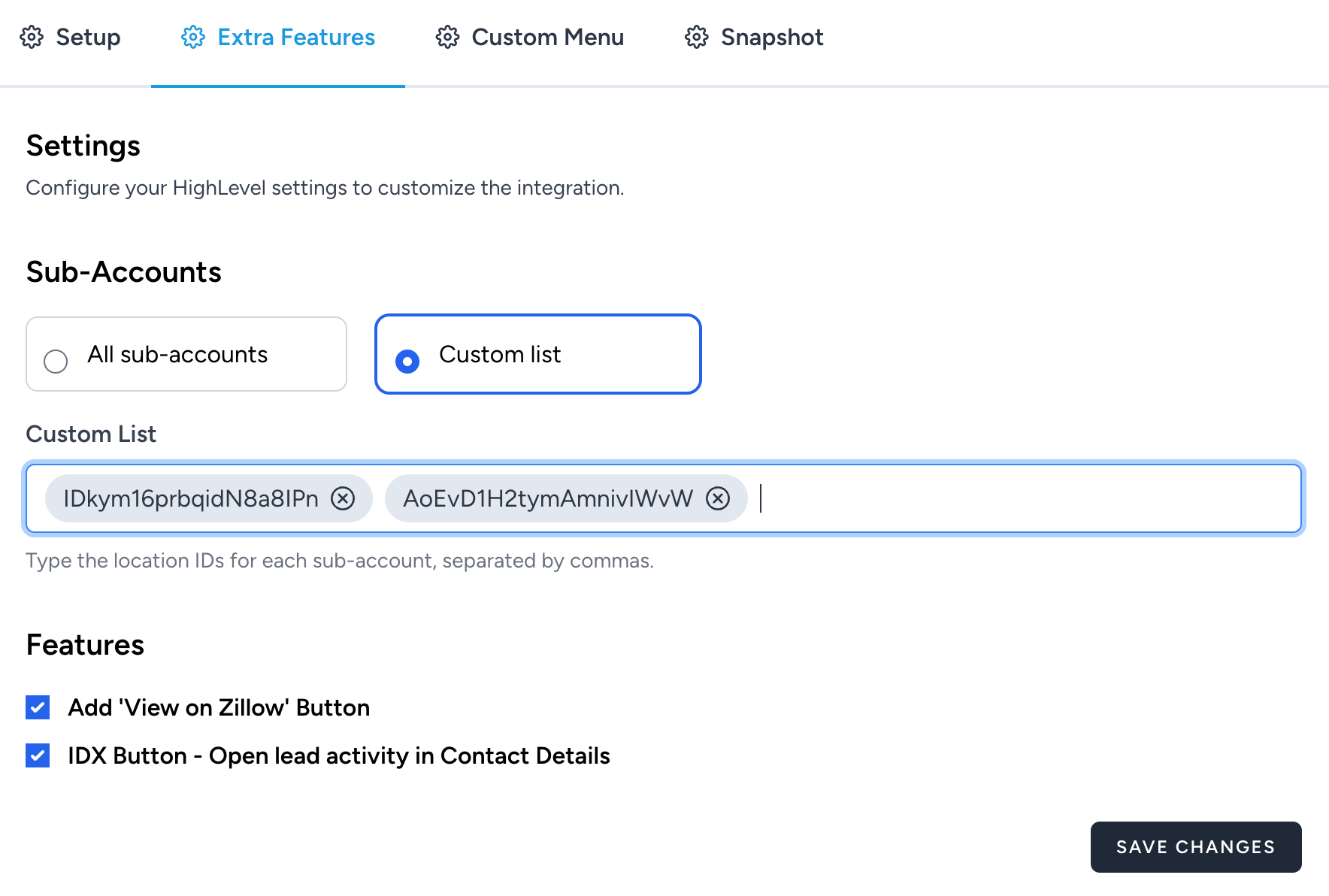In the Agency Extra Features, select the option "Custom List" and enter the sub-accounts' location IDs separated by commas. Then click on "Save changes".