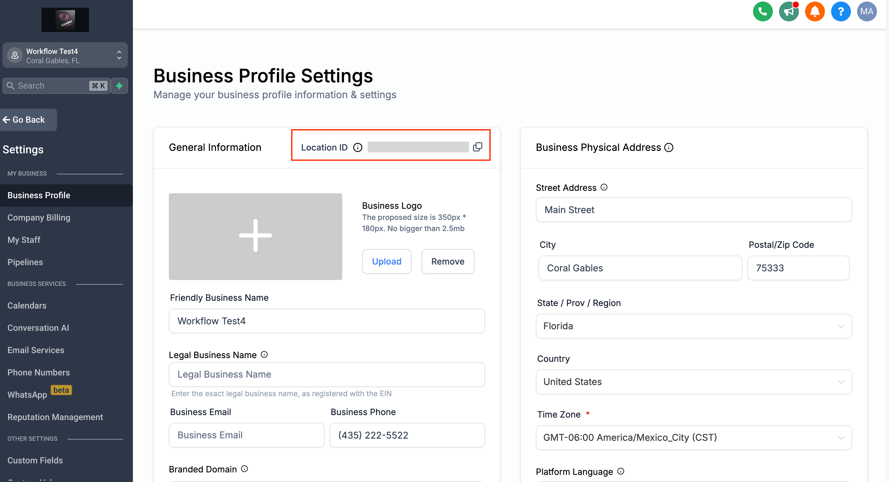 To get the location ID of a sub-account, go to the HighLevel sub-account Business Profile and copy the Location ID.