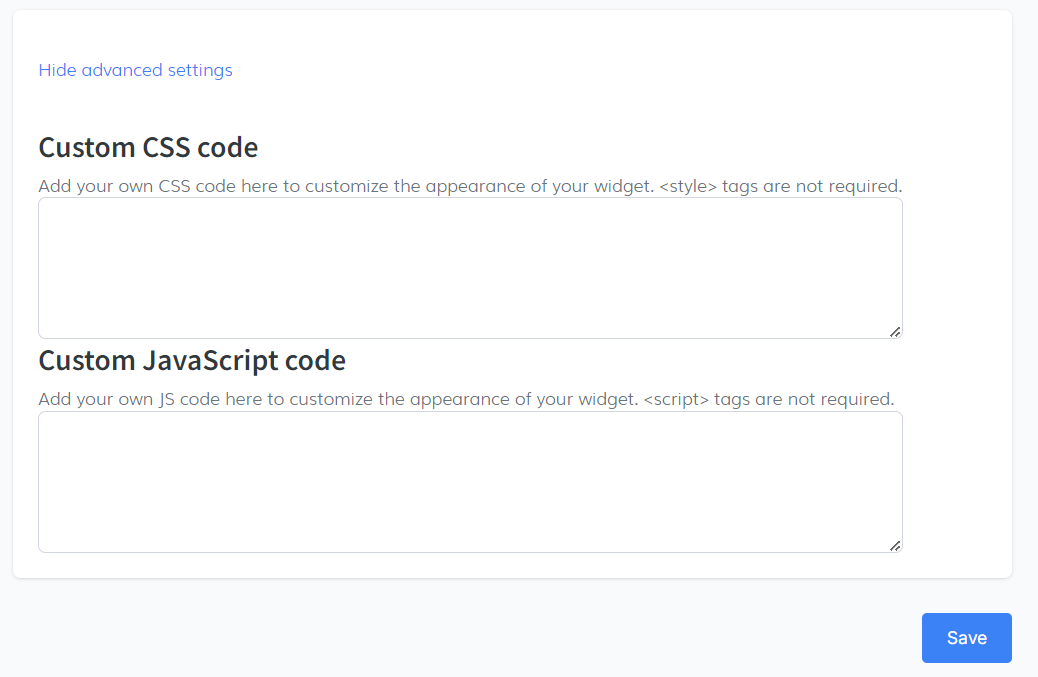 - Custom JavaScript Code: This option allows you to add your own JavaScript code to further customize the widget's functionality. Similarly, script tags are not required.