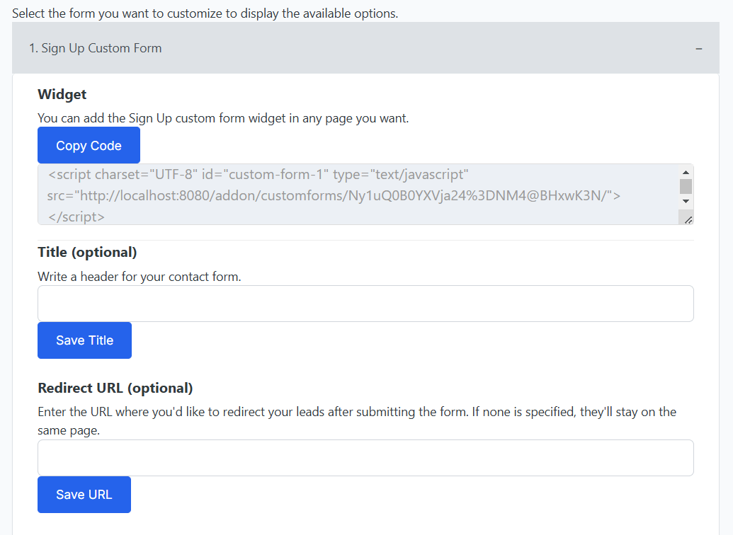 - Widget Option: The first option is the widget. Here, you can add your Sign-Up Custom Form Widget to any page you need. Simply click the Copy Code button to proceed.