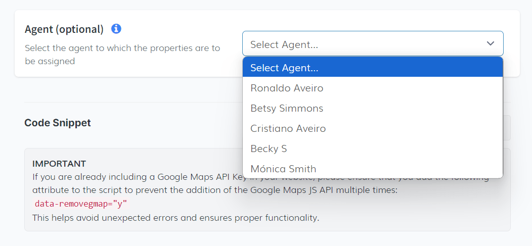 In this optional section, you can select the agent to whom the properties will be assigned and the information button is also available to provide relevant details about this option.