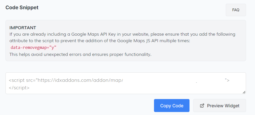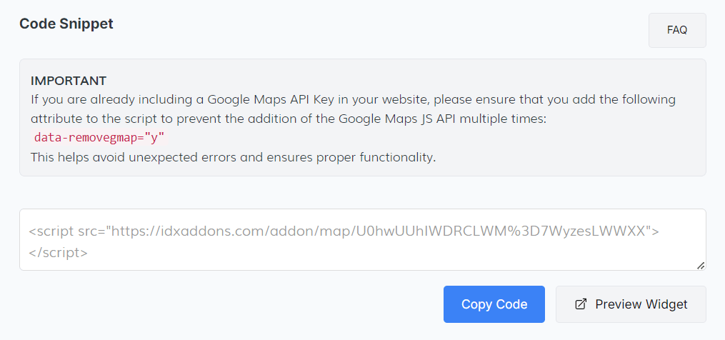 If your website already includes a Google Maps API Key, ensure you add the following attribute to the script to avoid loading the Google Maps JS API multiple times,to use the code, simply click the Copy Code button to copy the code snippet and paste it into your website.