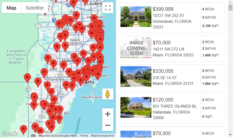 After setting your options, you can preview the map. Below is an example with a zoom level of 10 (City view), centered on Doral, Miami, showing featured listings