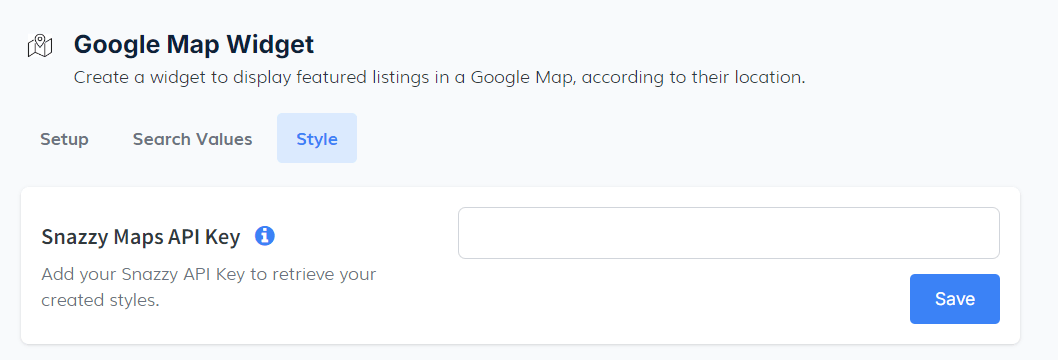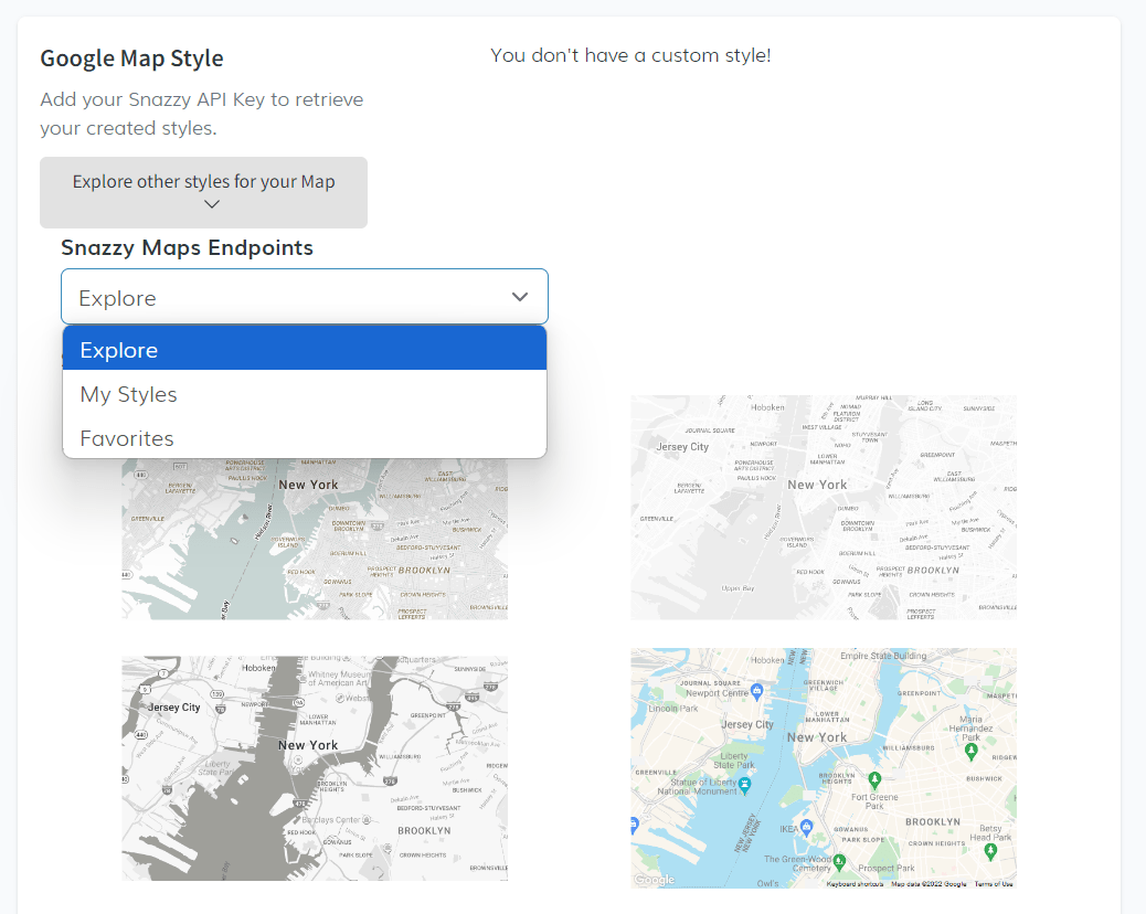 Snazzy Maps API KeyIf you have an API key, you can create custom styles for your maps. Enter your API key in the corresponding field and click the Save button to store your changes.