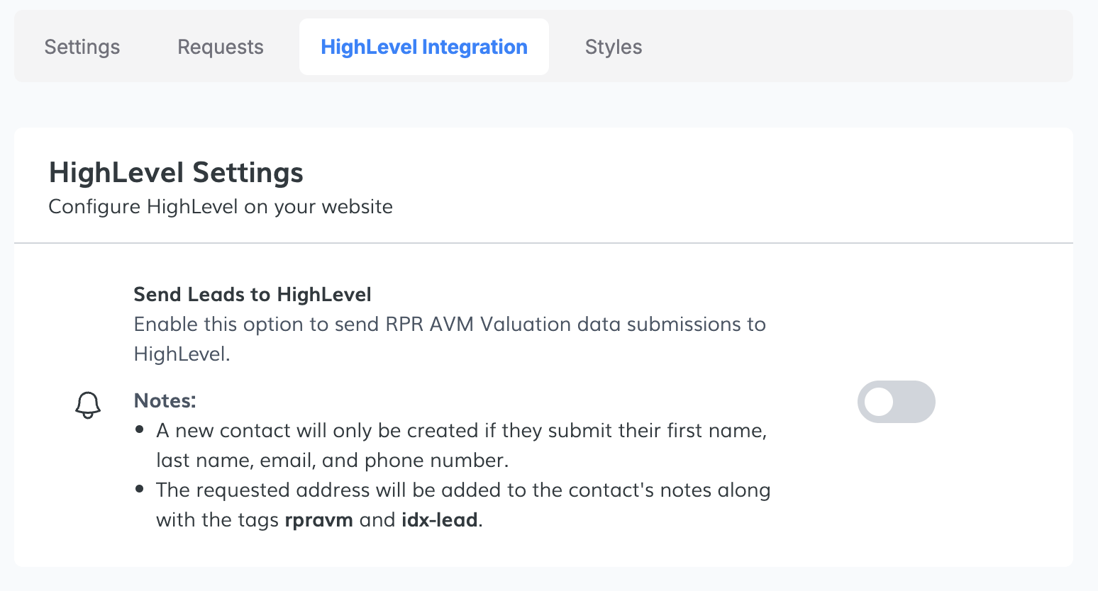 In the HighLevel Integration tab, you can enable the integration with HighLevel so that the requests are sent to your HighLevel account.