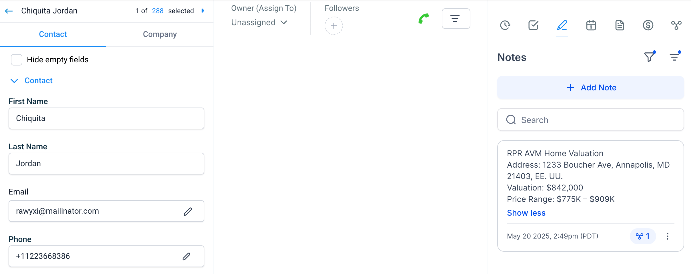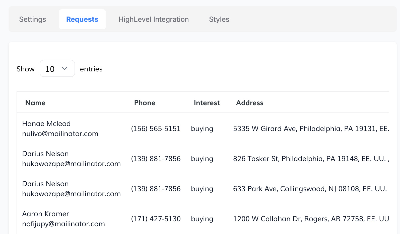 In the Requests tab, you can see the requests made by users. It will store the name, email, phone, address, the valuation, and date of the request.