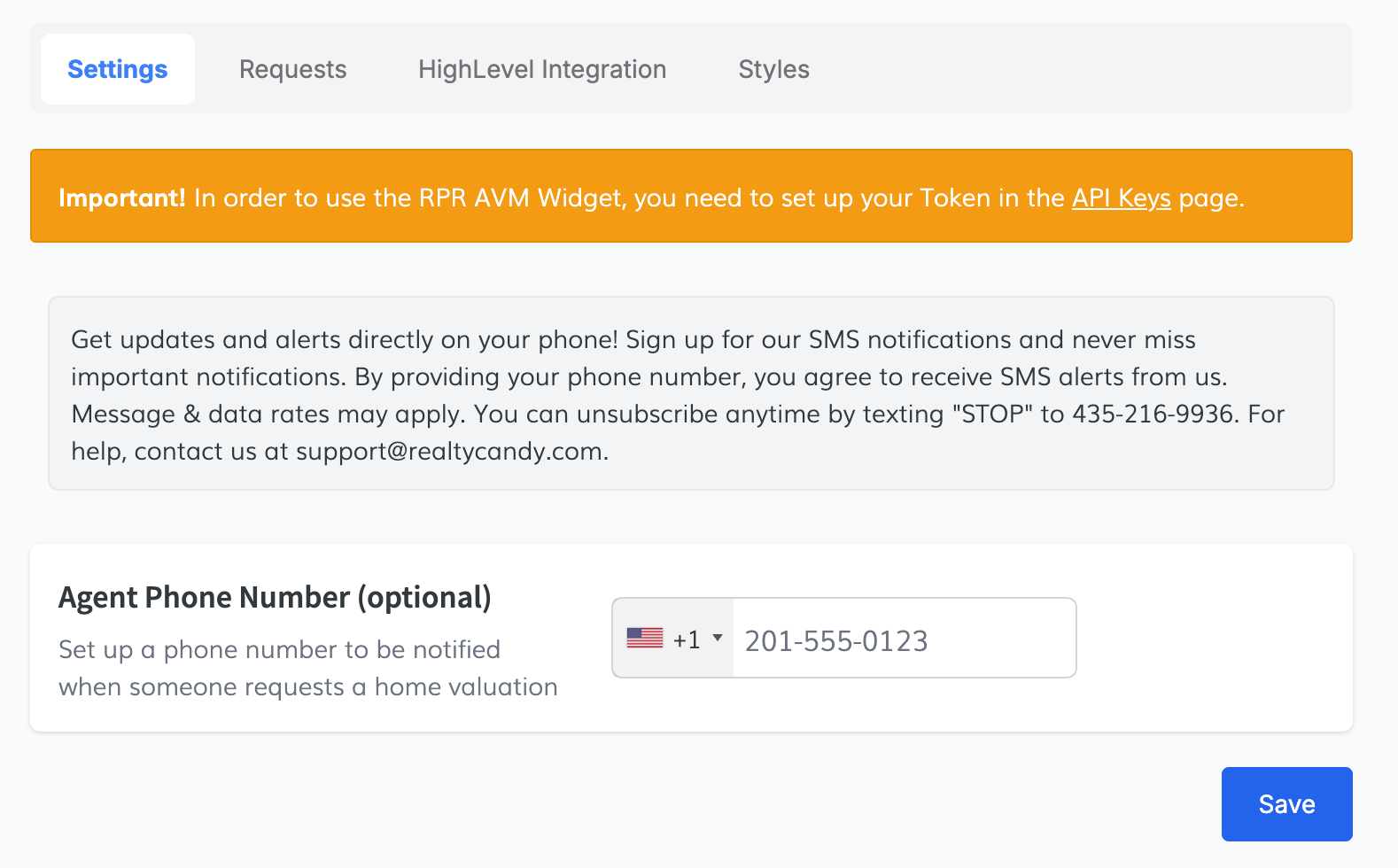 In the Settings tab, you can add a phone number to receive an SMS alert when a user requests a valuation.